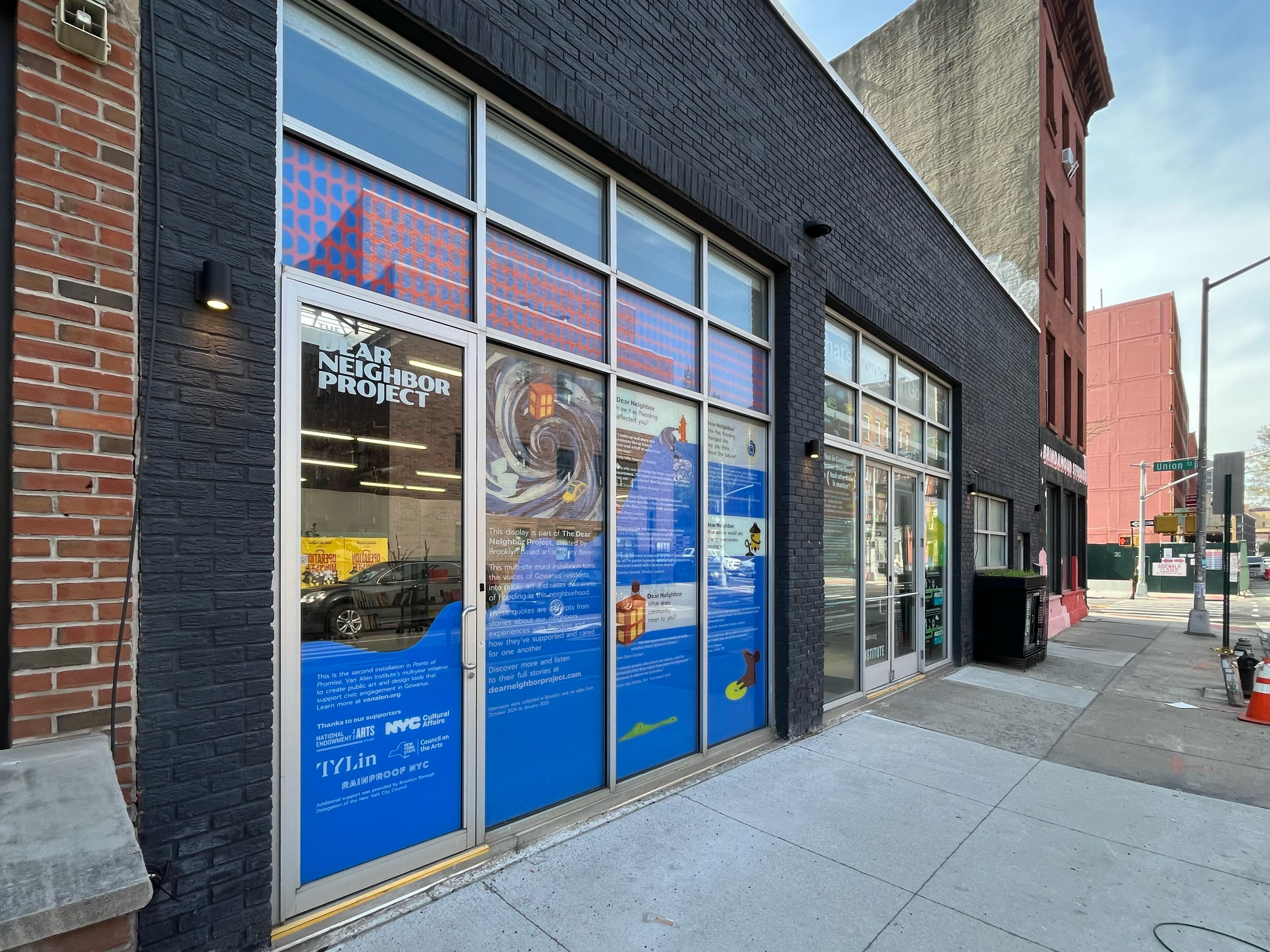 Van Alen Institute, a longtime advocate for design-driven public engagement, hosts The Dear Neighbor Project as part of its annual Points of Promise initiative. Now in its second year, Points of Promise invites artists and designers to explore civic issues through creative collaboration with Gowanus residents. The mural on view at Van Alen’s storefront gallery marks the beginning of the project’s journey across Brooklyn, featuring stories collected in response to ongoing flooding and climate change in the neighborhood.